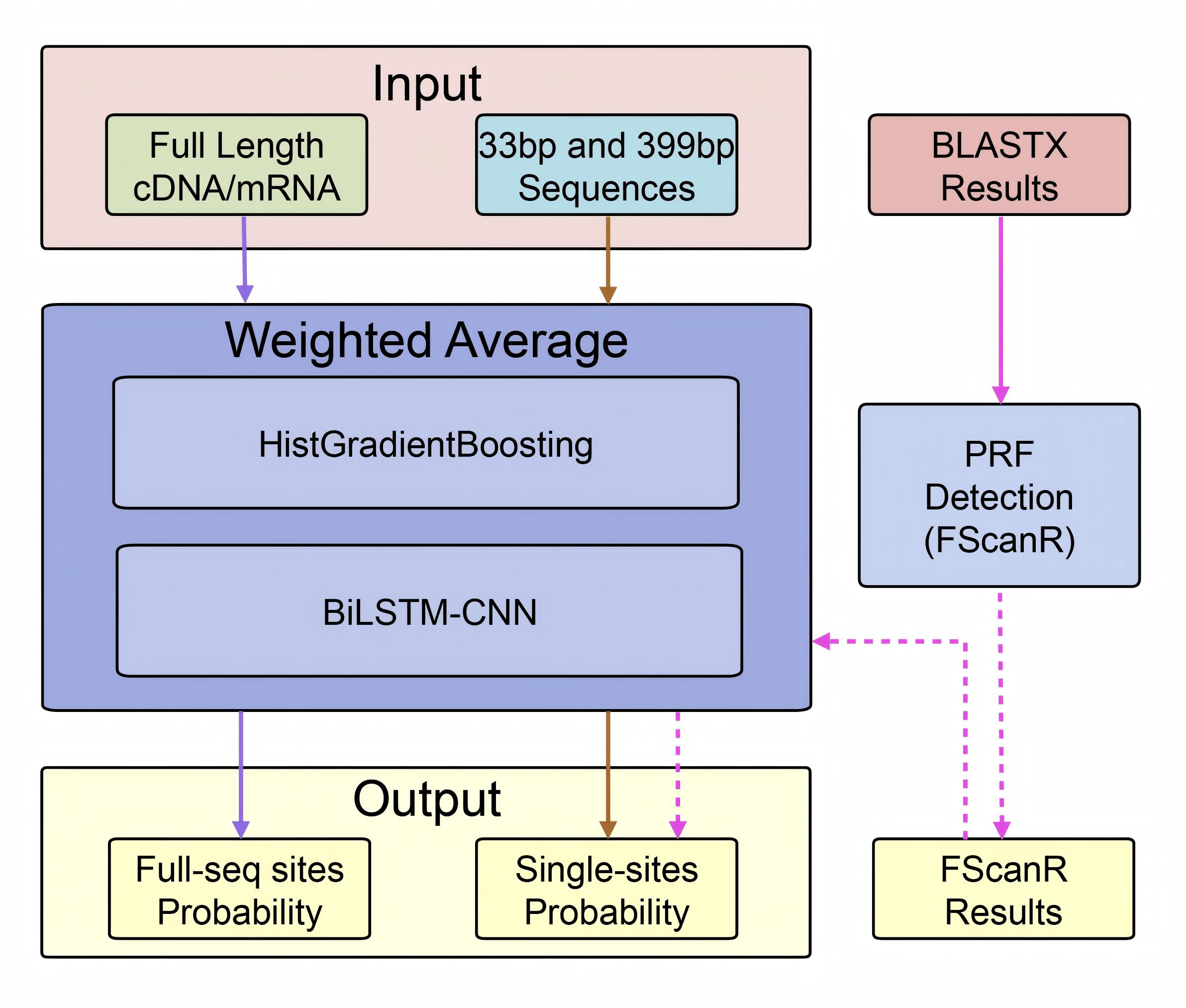 FScanpy is a comprehensive Python package designed for the prediction of Programmed Ribosomal Frameshifting (PRF) sites in nucleotide sequences. By integrating advanced machine learning approaches (HistGradientBoosting and BiLSTM-CNN) with the established FScanR framework, FScanpy provides robust and accurate PRF site predictions.
